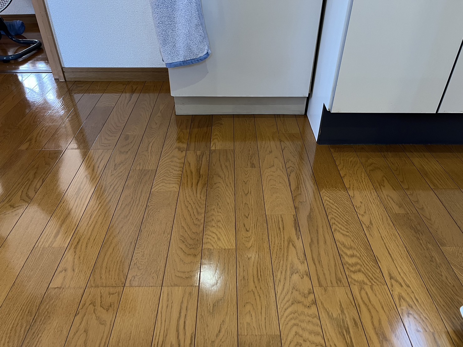 M様邸から、床ワックスがけのご依頼。洗面台とミニキッチンが並んでいる床が、油や皮脂汚れで黒ずみ、その部分が特に気になるとのことでした。