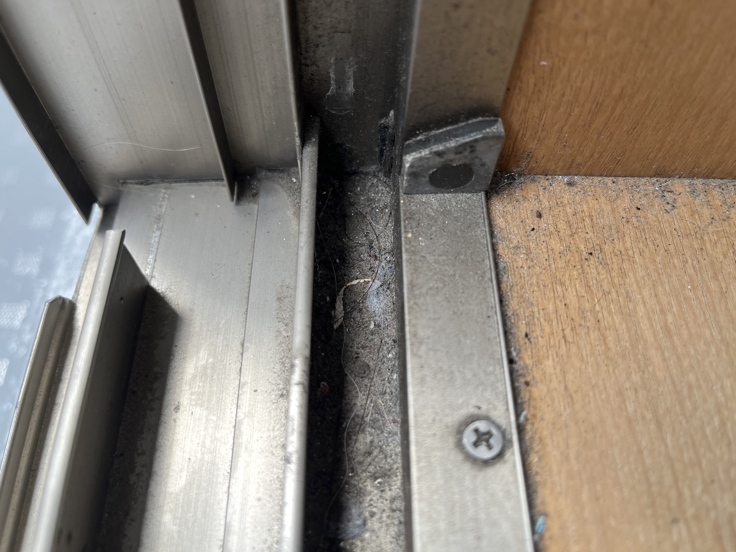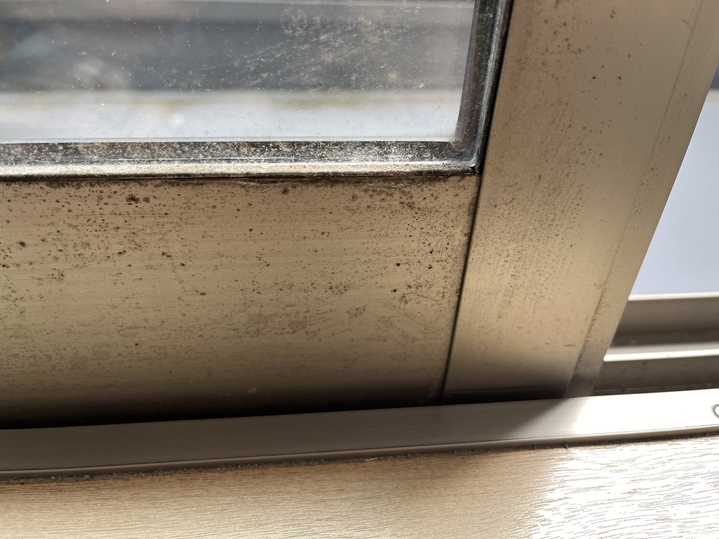 窓を開けて、サッシを見させていただくと、砂ぼこり、カビ、髪の毛などのゴミが溜まった状態でした。サッシは、こまめに掃除をしても、ゴミが溜まりやすい場所です。