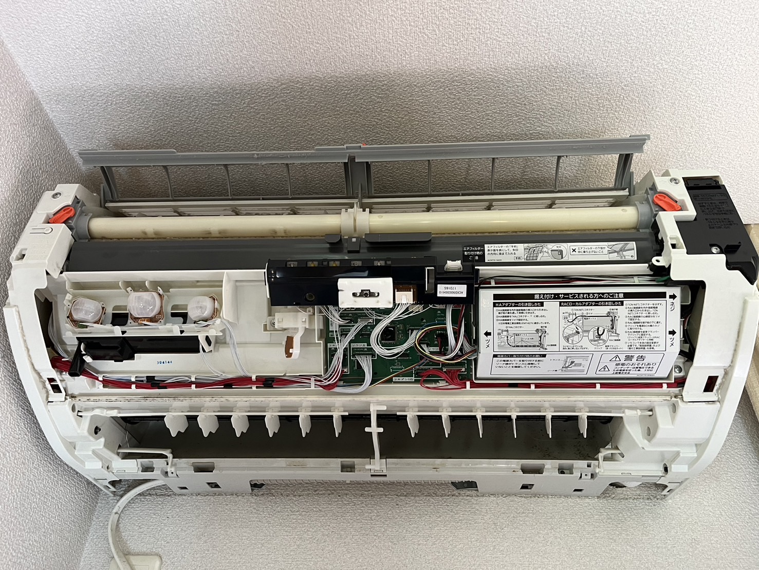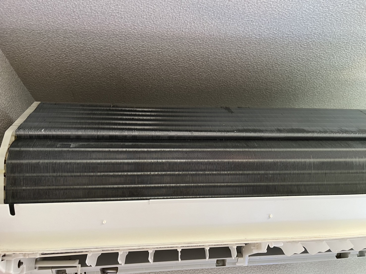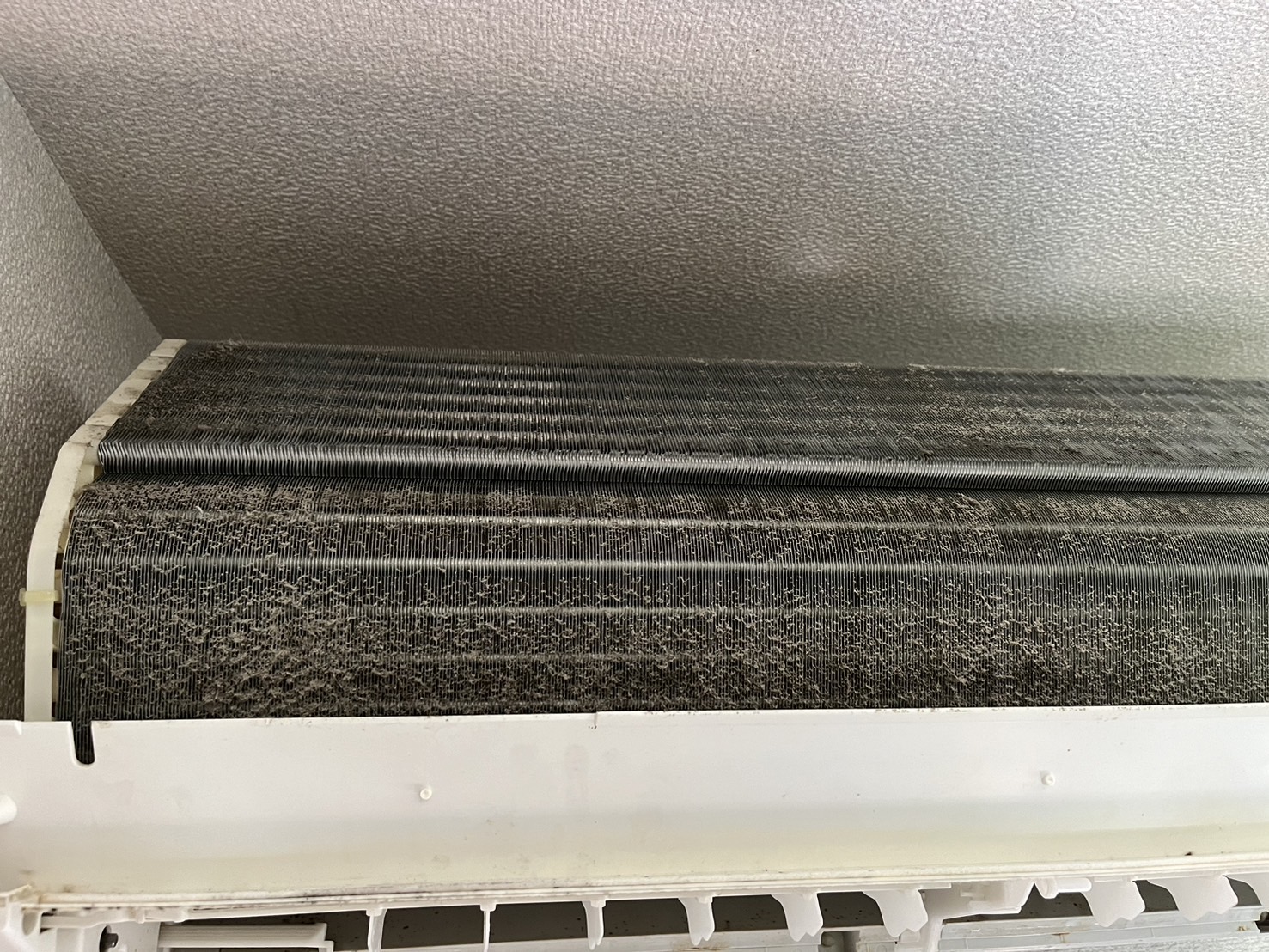 これは、お掃除機能を取り外した、クリーニング前の熱交換器です。ホコリがびっしり!!お掃除機能付きでもこのようになります。汚れによってエアコンの機能は低下し、水漏れの原因にもなりかねません。