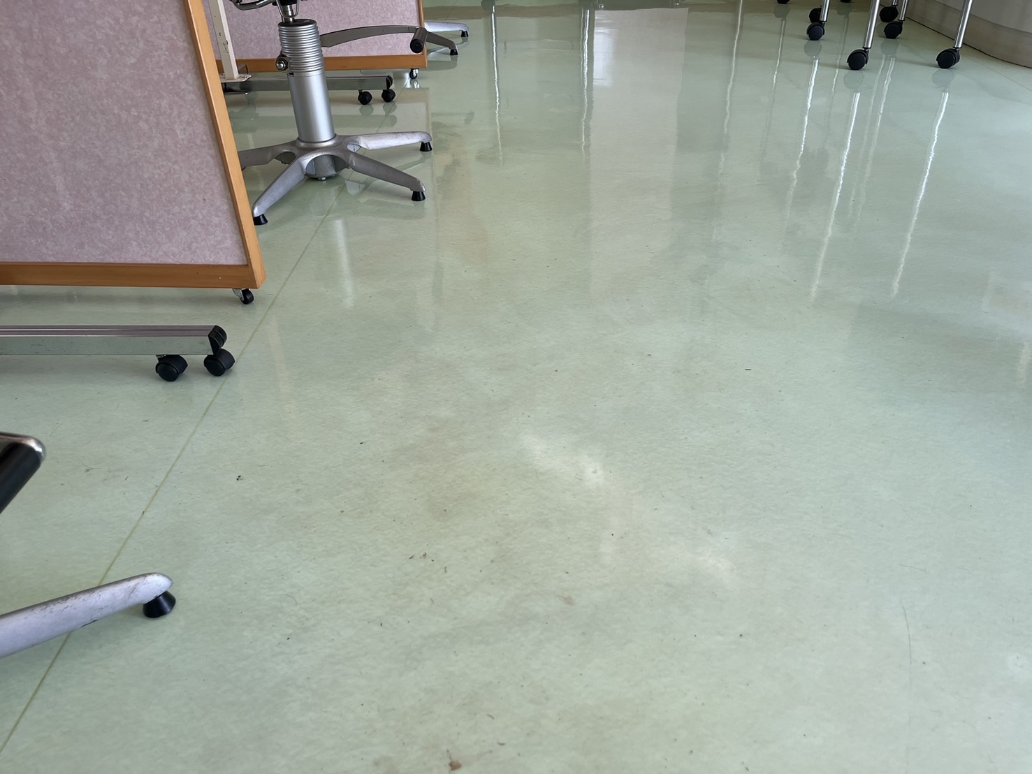 今回の床ワックスがけは、美容師さんの立ち位置のところを気にされていたので、一部剥離を行いました。