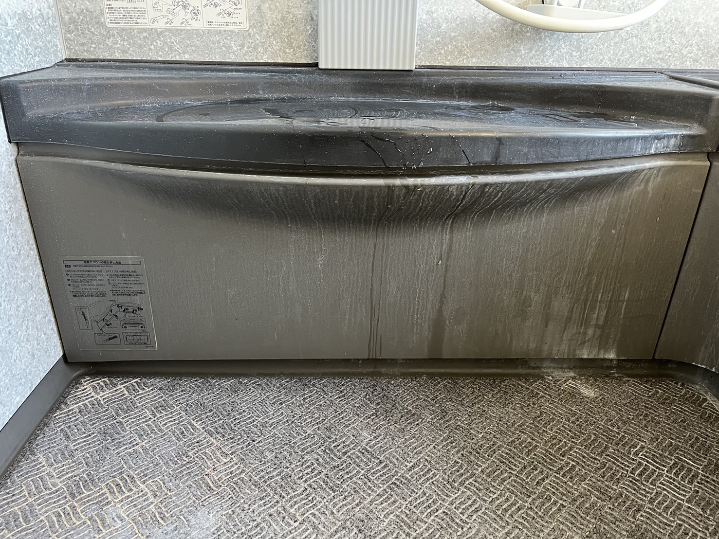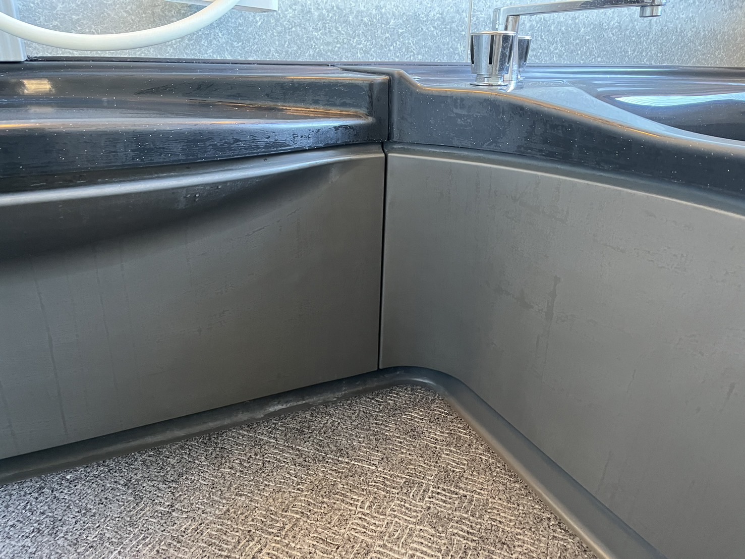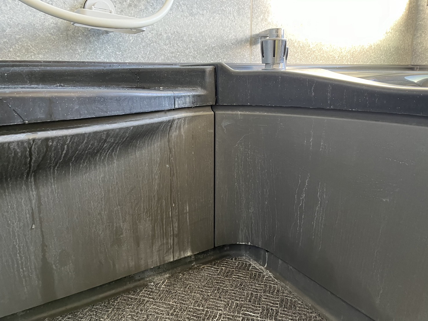 S様から水まわりのご依頼 浴室は黒色の為、汚れが目立ちます。 また傷も目立つ為、慎重に磨きます。 研磨力の弱いクレンザーを使用し研磨材シートで磨きます。