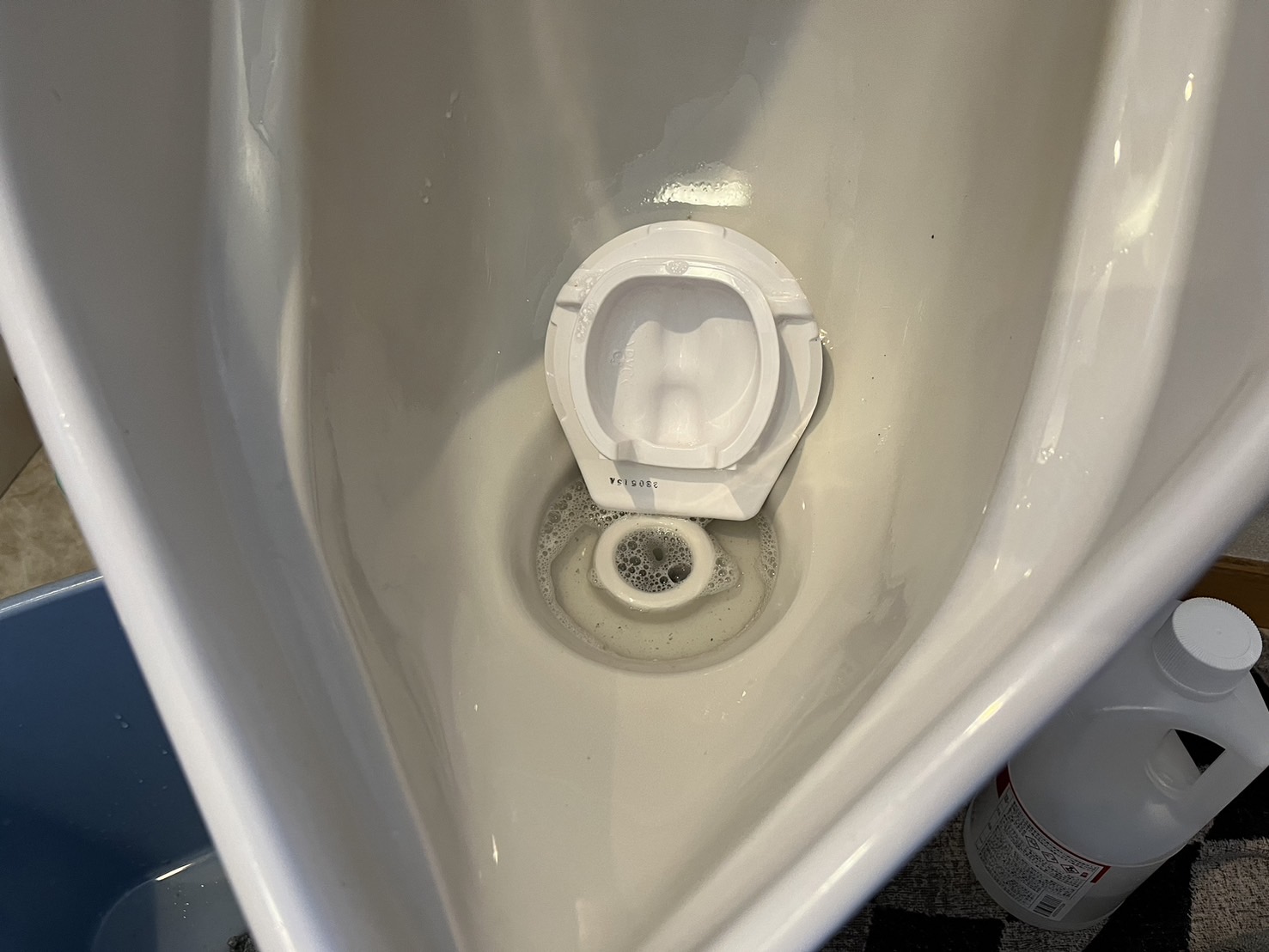 トイレは男性用の便器が付いている広いトイレで、目皿も排水口も、しっかり尿石剤につけてキレイになりました。