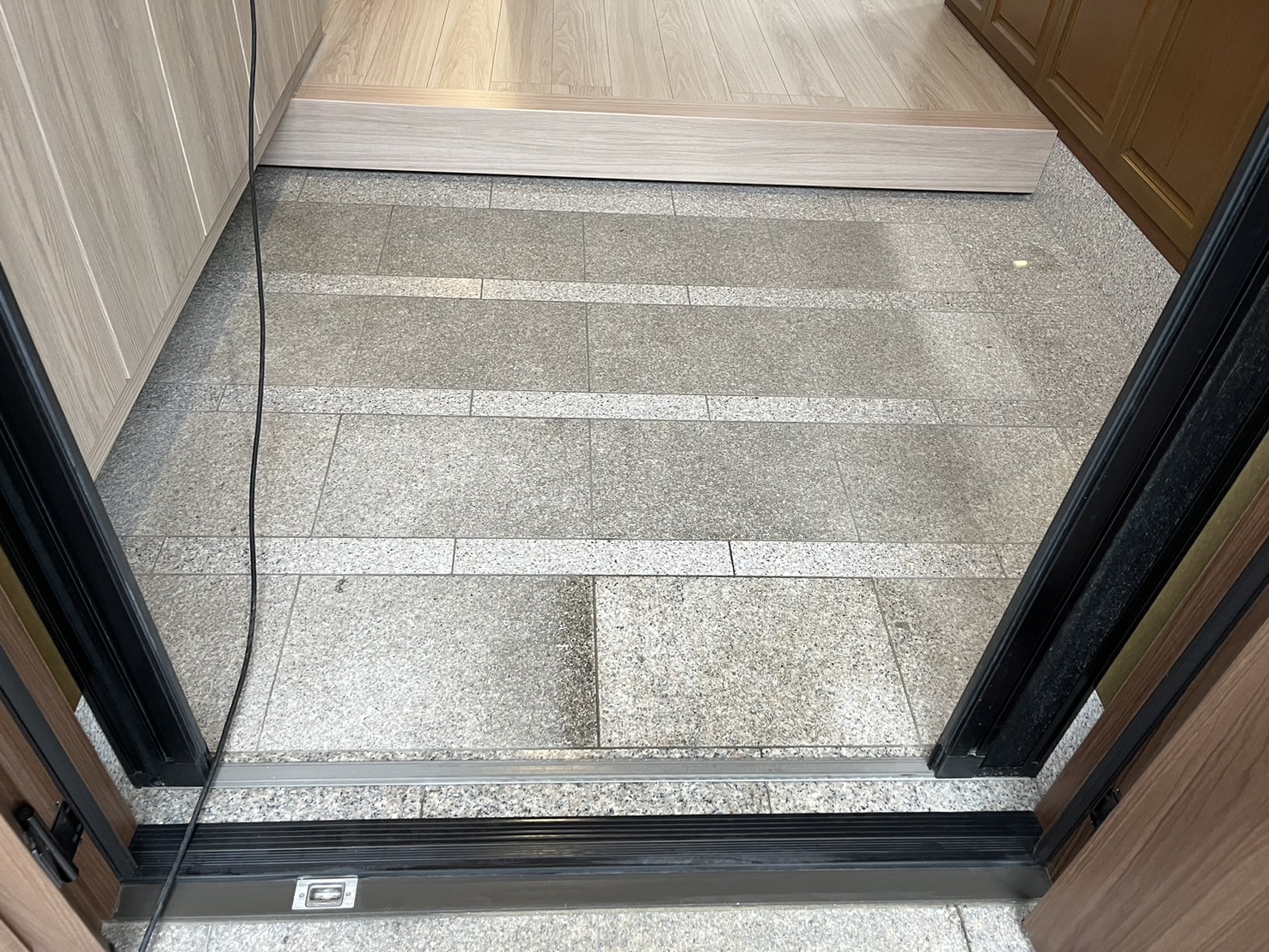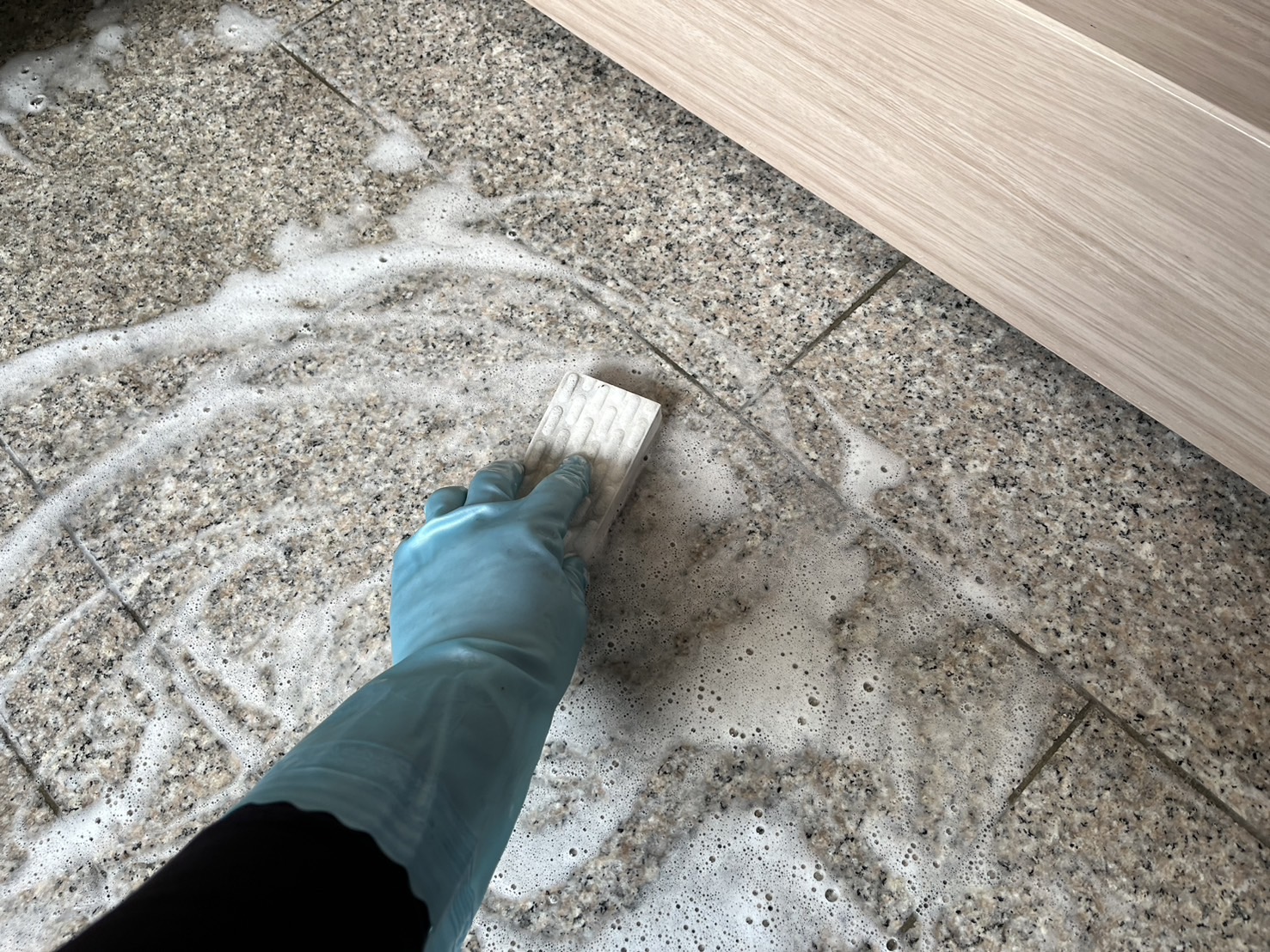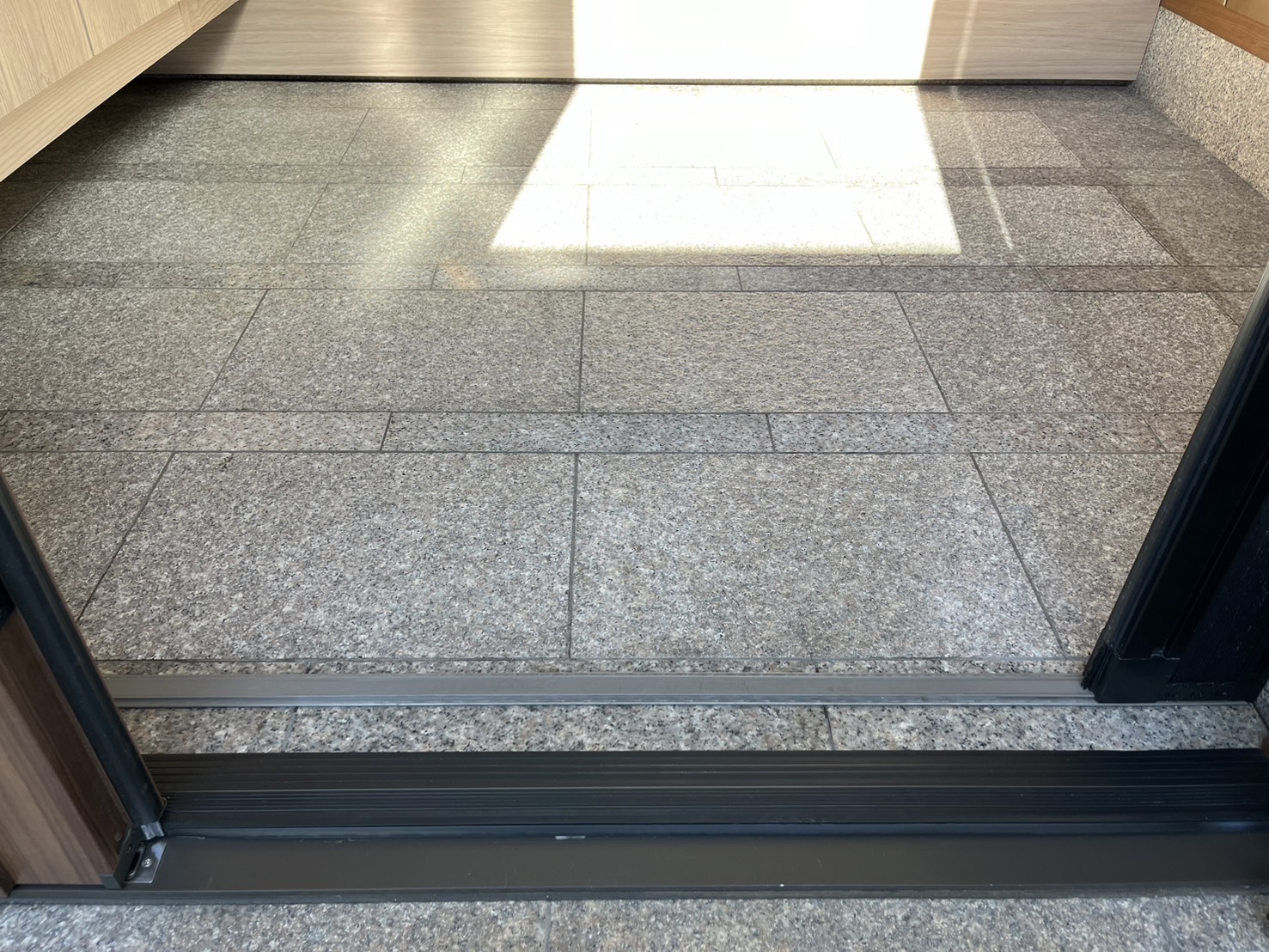 玄関土間はアルカリ剤、中性剤を使用しメラミンスポンジで擦り、水を流してモップで吹きあげキレイになりました。