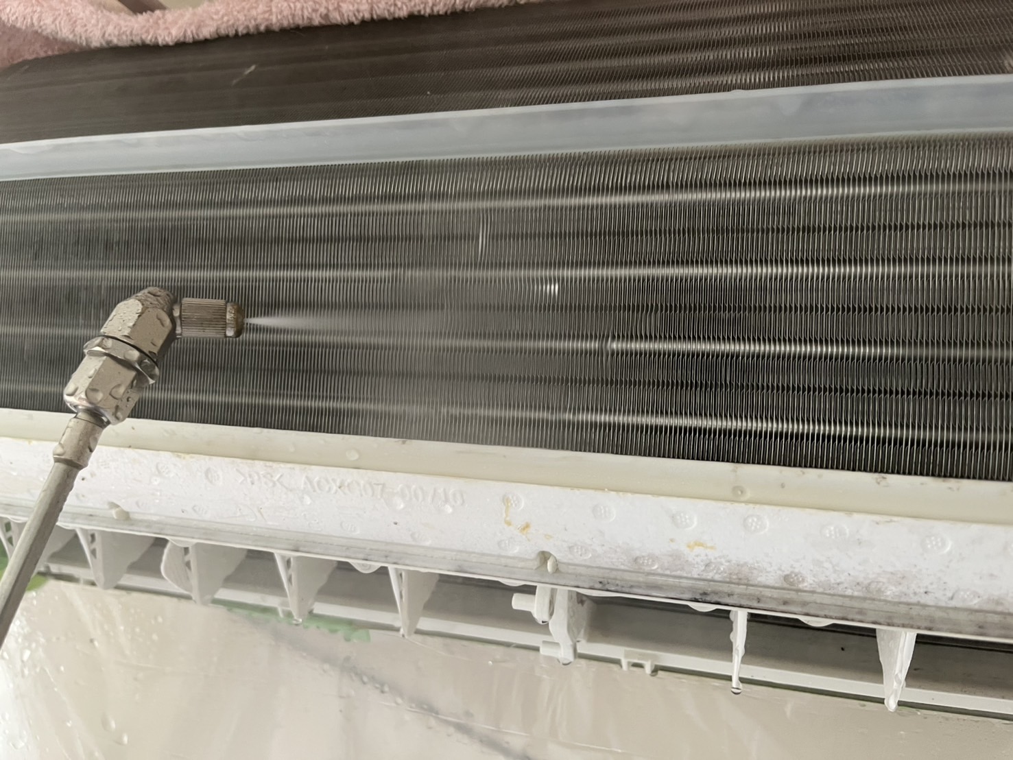 高圧洗浄機でアルミフィン、送風ファンを洗浄します