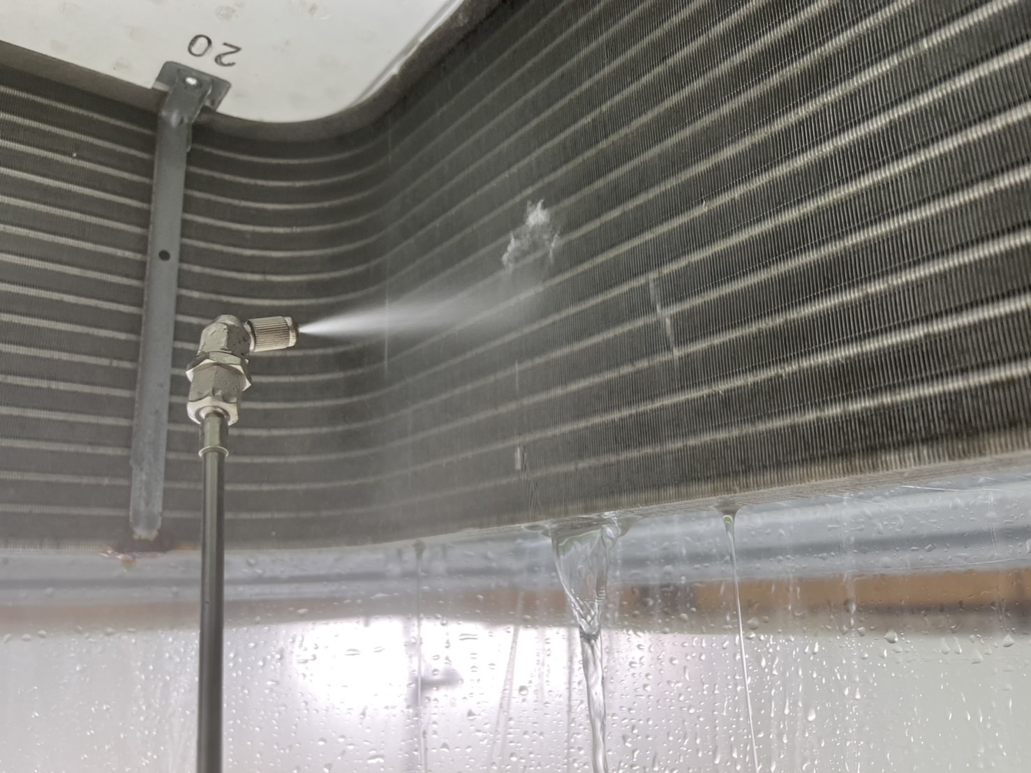 高圧機でアルミフィンを洗浄中
