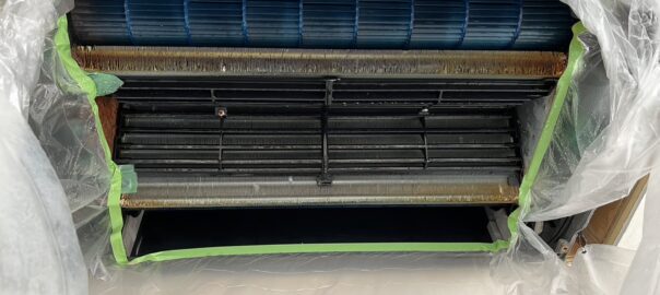 吹き出し口1方向のエアコン。 1方向とはいえ、大きめでファンをモーターと一緒に取り外し、モーターに水がかからないように、養生をしてファンを洗浄をします。 その他、2方向や壁掛けエアコンを数台クリーニングしました。