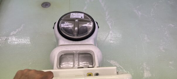 美容室の床ワックス掛け カラー剤等で、足元が特に汚れてしまいます。 洗浄機使用中 洗浄と同時に汚水を回収していく、二役をしてくれます。 一部剥離作業をしました。 反射するほど綺麗になりました。