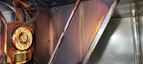 油がべったりで、まず油汚れ落とし洗剤をハケで塗布します。 潜り込んでの作業の為大変です! その後スチームで汚れを柔らかくして、擦って拭き取るを繰り返します。 髪やマスクが汚れましたが、きれいになりました。