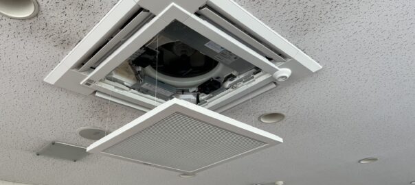 天井埋め込み4方向エアコン2台 天井吊り型エアコン1台のクリーニング 一般の家庭と違い天井高があり コネクタの取り付けに慎重になります。 天吊りエアコンとドレンパン